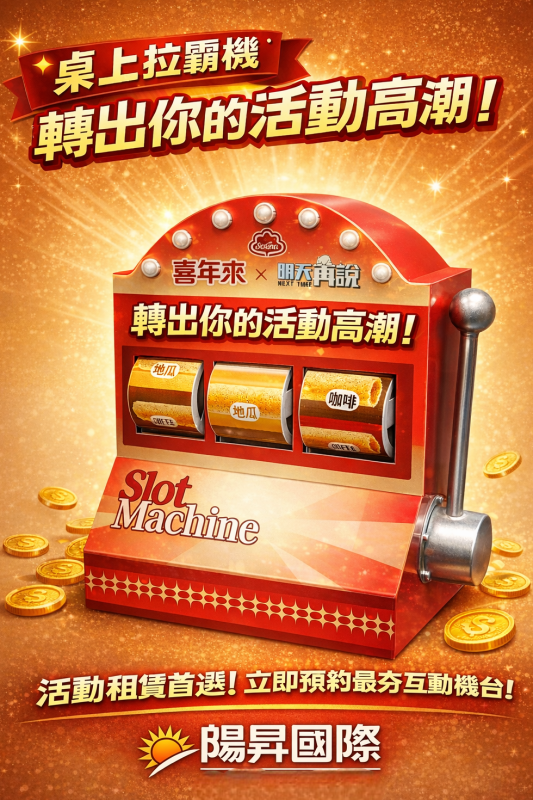 桌上拉霸機小型拉霸機吃角子老虎機活動租賃首選企業活動展覽活動商場活動必備遊戲機租賃遊戲機買賣陽昇國際 mimico0604 2026 年 4 月 16 日 拉霸機 / 最新活動 桌上拉霸機推薦|活動租賃首選 陽昇國際 桌上拉霸機租賃、活動互動遊戲設備、尾牙春酒遊戲機推薦 讓你的活動不再冷場,直接升級成全場焦點 桌上拉霸機|小巧設計 × 高互動體驗 活動租賃首選|企業活動 / 展覽活動 / 商場活動必備 陽昇國際|專業活動設備租賃品牌 #桌上拉霸機租賃 #拉霸機出租 #活動遊戲機租借 #互動遊戲設備租賃 #吃角子老虎機 #春酒互動遊戲 #展場吸睛設備 #活動暖場道具 #企業活動互動遊戲 尾牙活動遊戲機 春酒活動互動設備企業活動租賃|展覽活動吸睛道具 百貨商場活動|品牌快閃活動 親子活動設備|開幕活動互動遊戲 桌上拉霸機 小型拉霸機 吃角子老虎機 遊戲機租賃 遊戲機買賣 陽昇國際 歡迎來電洽詢, 專人為您服務 免費客服專線: 0800-423-888 公司電話: 02-2682-3888 分享此文:分享到 Twitter(在新視窗中開啟)按一下以分享至 Facebook(在新視窗中開啟)分享到 Tumblr(在新視窗中開啟)分享到 WhatsApp(在新視窗中開啟)按一下即可分享至 Skype(在新視窗中開啟)點這裡寄給朋友(在新視窗中開啟) You Might Also Like 2020.02.14辰光之愛-馬卡龍扭蛋機 2021 年 4 月 9 日 2019.7.24 樂旅思途-拉霸機-HZ娃娃機- 台北W飯店 2021 年 3 月 30 日 台灣大車隊-員工家庭日-各項活動遊戲機租賃-陽昇國際 2015 年 1 月 21 日